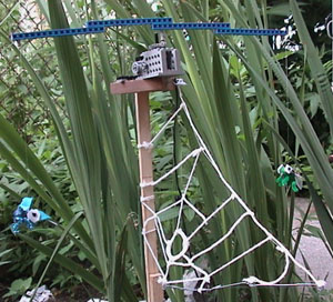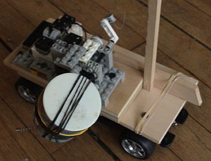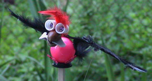 Cuckoo Bird: (Click to watch the cuckoo bird fly.) This cuckoo bird flies on top of a Remote Controlled Set of Wheels. Arms on the axels of a Sidewinder Gear Train control strings that make the wings flap. A bird chirping sound device attached to the Sidewinder Gear Train axel provides the sound effects. The cuckoo bird is made from a plastic ball (the body), a broken pecan nut (the head) and two tooth paste lids (the eyes). |