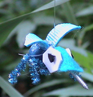 Tropical mosquitoes circling: (Click to watch the mosquitoes circling.) When a Power Top Gear Train makes an arm spin, the flies take off. An arm attached to a motor that hits a piece of cellophane from a business envelope makes a mosquito buzzing sound. The wings on this fancy mosquito are made from a blue, plastic, bottle cap. The bottle cap was smashed by a rock and then two pieces were snipped with a pliers to make it just right. Follow the Tool Rules and wear your goggles when you do this!!!