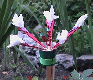 | Blooming Tropical Flower: (Click to watch the petals open.) The basic Sidewinder Gear Train controls a long arm that pushes a flexible wire through a plastic cup. The flower blooms when the wire is pushed up and closes when the wire is pulled down. The slip gear on the Sidewinder Gear Train keeps the gear train from breaking up when the lever arm reaches its stop points. The flower is made from 5 Popsicle sticks hot glued to a small round piece of foam rubber. The Popsicle sticks were decorated with foam rubber and toilet paper. The stamen are pipe cleaners with a bead on the end. The pistil is the round piece of foam rubber on which the Popsicle sticks are glued.