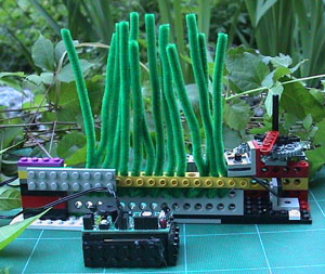 |  | Swaying Grass: (Click to watch grass sway in the wind.) A Power Top Gear Train pushes a beam with grass blades attached. When the beam hits a touch sensor, the motor reverses and a rubber band pulls the beam back. The control program repeats the sequence when the wind is blowing.