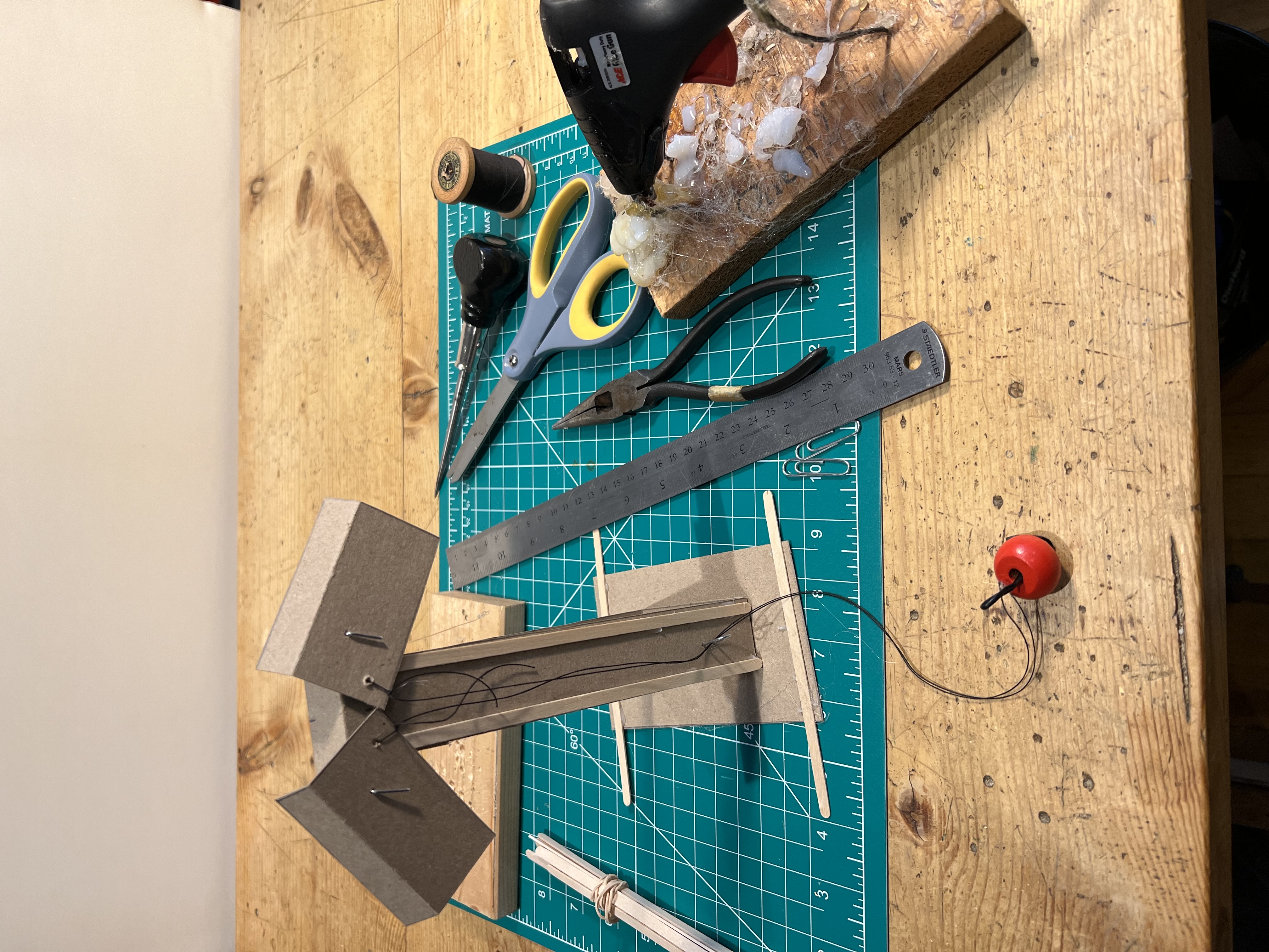 This mechanism could make wings flap. It's made from cardboard, coffee stirer sticks, string, and paper clips. |